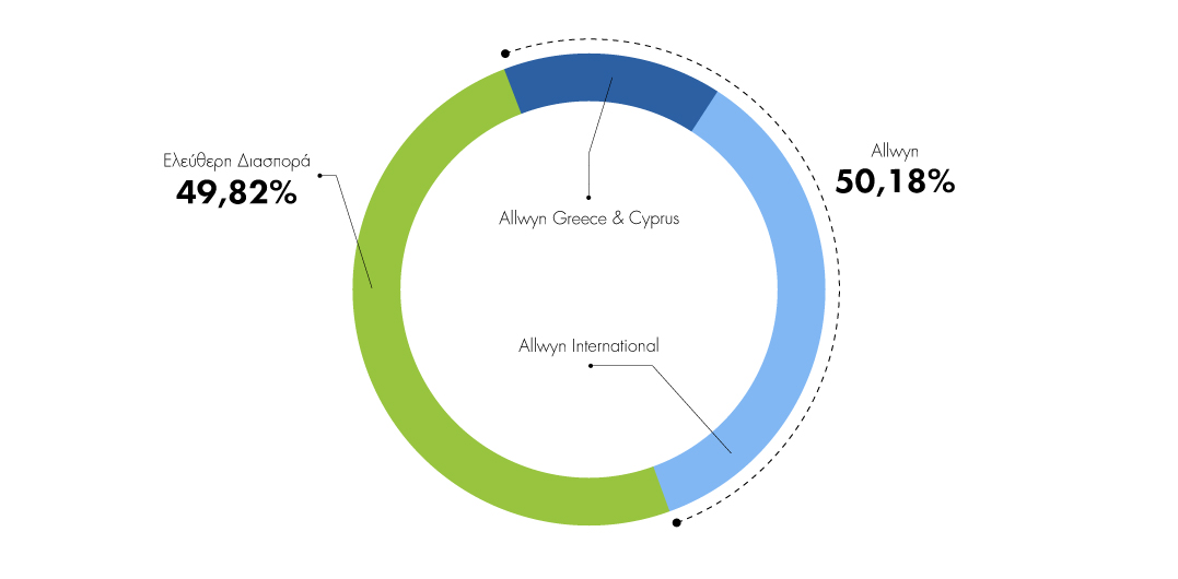 Η Allwyn είναι ο στρατηγικός μέτοχος του ΟΠΑΠ κατέχοντας το 50,18% (από τις 27/06/2023) των δικαιωμάτων ψήφου της εταιρείας. Αυτή η θέση δημιουργήθηκε σταδιακά μετά την ιδιωτικοποίηση της εταιρείας (δ’ τρίμηνο 2013), την Δημόσια Πρόταση (δ’ τρίμηνο 2019) και τις περιοδικές συμμετοχές στα προγράμματα επανεπένδυσης μερίσματος. Η εναπομείνασα ελεύθερη διασπορά κατέχεται κυρίως από διεθνείς θεσμικούς επενδυτές και ένα μικρότερο μέρος ανήκει σε Έλληνες θεσμικούς και ιδιώτες επενδυτές.